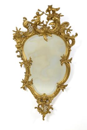 Hochrechteckiger Spiegel mit Pferdewagen und Antikenfigur im Gebälk sowie Floraldekor im Sockelbereich