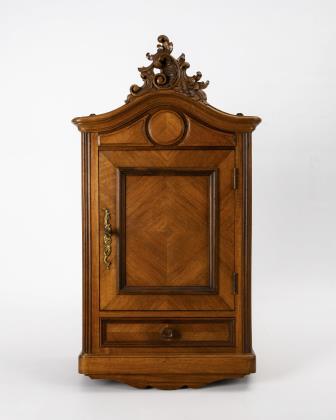 Schlanker 2-türiger Korpus mit bogensegmentiertem Giebel und offenem Mittelfach, auf 2 Kugel- und 2 Klotzfüßen. Verziert mit Kehlungen, Rahmenleisten, beschnitztem Floralwerk und facettierten Glaselementen. Stiltypische Schlüssellochbeschläge aus Messing mit Ringgriffen