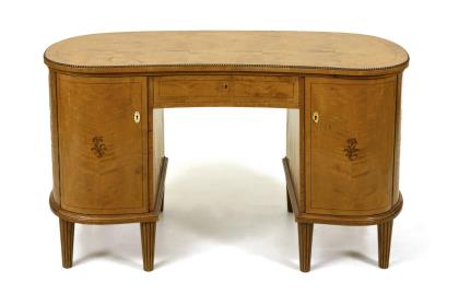 Nierenförmiger, 2-türiger Korpus mit Beinaussparung und 1 Mittelschub, auf 8 konischen und kannelierten Füßen. Deckplattenkante mit umlaufender Perlschnur, Fadeneinlagen, Türen jeweils mit einer Blumenmarketerie. Ovale Schlüssellochbeschläge, teils defekt, teils fehlend. Linker Flügel mit 3 Auszugsfächern, rechter Flügel mit 2 Ablagefächern