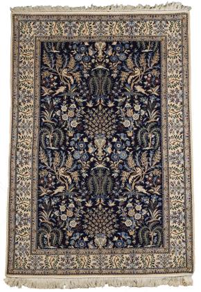Floral gemustertes, nachtblaues Mittelfeld mit üppigen Blumenvasen, flankiert von unterschiedlichen Bäumen, Vögeln und Hasen. Crèmeweiße, dreireihige Bordüre mit alternierenden Baum- und Vasenmotiven. Fransenabschlüsse, lederverstärkte Längsseiten. Ergänzte Wandaufhängung