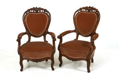 Geschweifte Rückenlehne, gepolsterte und s-förmig geschwungene Armlehnen mit beschnitzten Voluten, gerade Zarge mit Profilleiste, auf 4 volutierten Füßen. Jüngere Polsterung, rot-weiß gestreifter und geblümter Stoffbezug