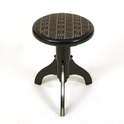 Zargenrahmenkonstruktion mit geschweift geschnittenem Schulterbrett und Mittelsteg. Breite, trapezförmige Polstersitzfläche mit Streifenstoffbezug, auf 4 gebogten Spitzbeinen. Mit zusätzlichen, angebundenen Polsterschutzbezügen
