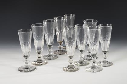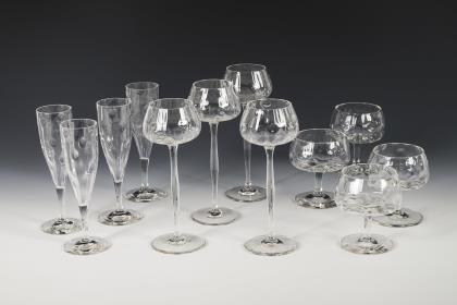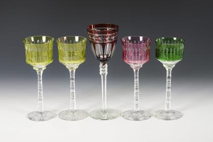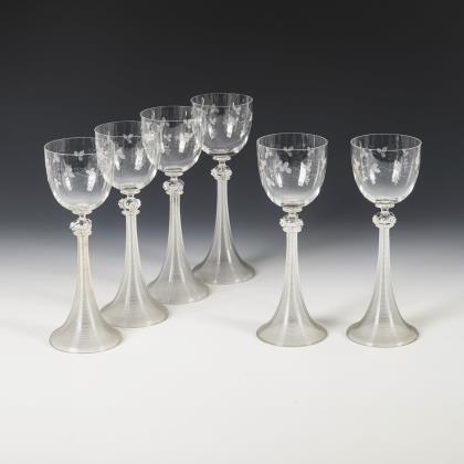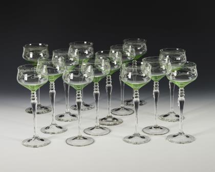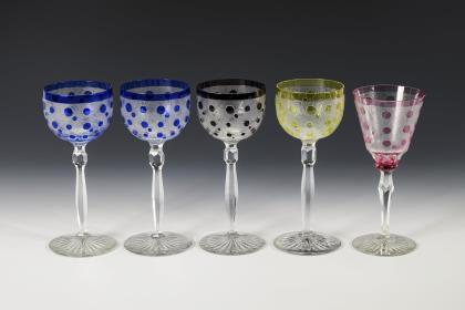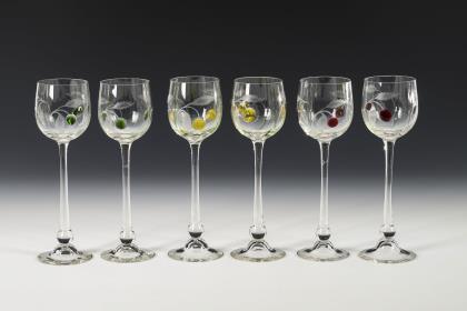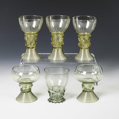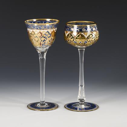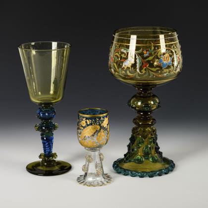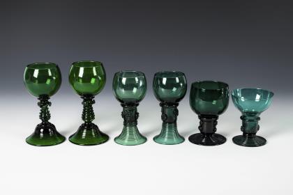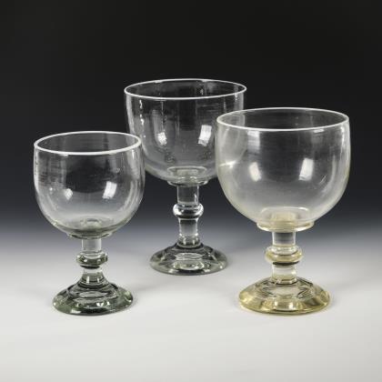 Spitzkelche, mehrfach gegliederter Hohlschaft, Rundfuß. Schauseitig ein graviertes Wappen mit Weintraube