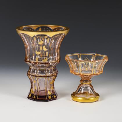 1x achtfach facettierte, dreifach gestufte Vase aus zartviolettem Glas: auf der Wandung nadelgeätzte und vergoldete floral-geometrische Ornamente, Facetten und Mündungsrand goldkonturiert. / 1x Fußschale aus zartrosafarbenem Glas mit achtfach facettierter Kuppa und glockenförmigem Fuß mit Nodus: auf Fuß und Kuppa nadelgeätzte und vergoldete vegetabile Ornamentik, Fußrand und Facetten goldkonturiert; signiert "Radierung Hest"