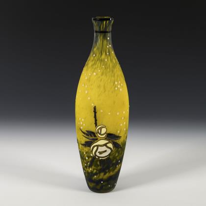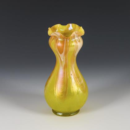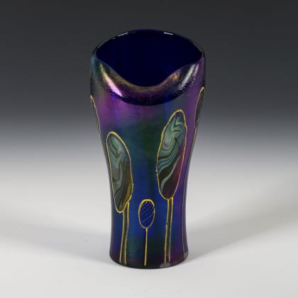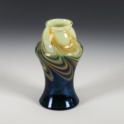 Balustervase mit einseitig eingedrückter Mündung. Auf der Wandung alternierend fünf über einem "Stängel" ovoide, marmorierte Fadeneinlagen aus vielfarbigem Glas und vier in gelbem Hochemail gemalte Ovale, gelbe Hochemailkonturierungen