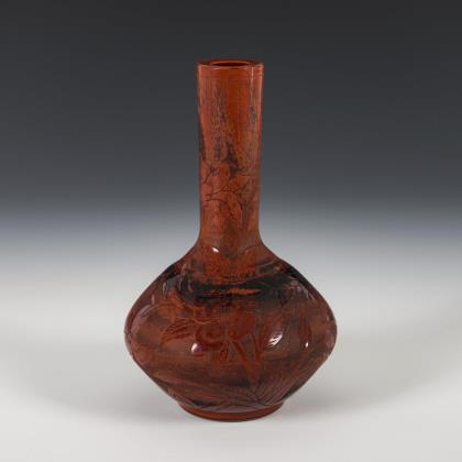 Gedrückt bauchiger Korpus mit langem, zylindrischem Hals; ausgekugelter Abriss. Auf der Wandung ein matt geätztes und graviertes Floraldekor
