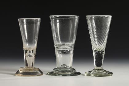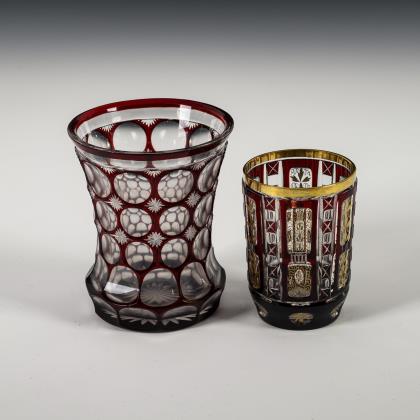 1x um 1840/50: Kraterbecher mit Linsenmuster und Bodenstern. /1x um 1930: Zylinderbecher mit Kerb-, Walzen- und Linsenschliff sowie Goldmalerei