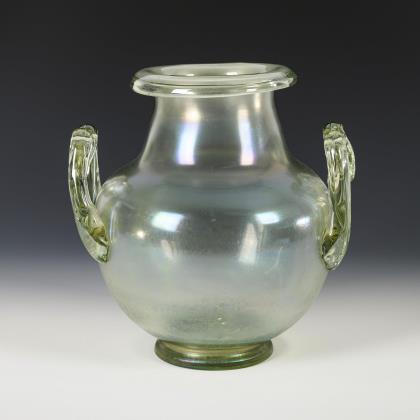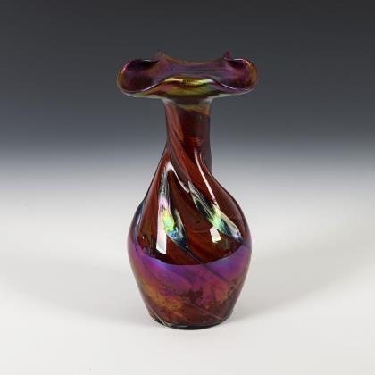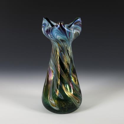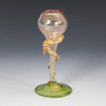 Flötenvase, zur Mündung hin rechteckig ausgeformt; ausgekugelter Abriss. Auf der Wandung ein spiralförmig aufgelegter Glasstrang mit als Schlange ausgeformtem oberen Ende