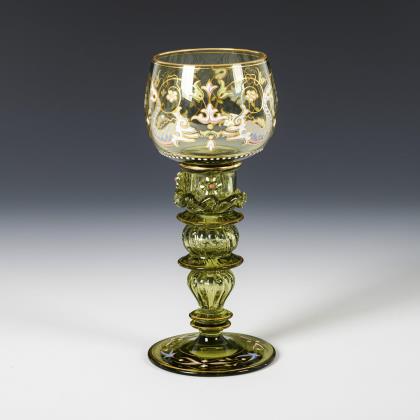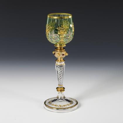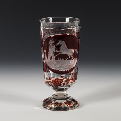 Neunfach facettierte Kuppa, kurzer Schaft, polygonaler Fuß; ausgekugelter Abriss. Schauseitig ein hochgeschliffenes Medaillon mit der gravierten Darstellung einer Landschaftsinsel mit Palme, darauf ein südamerikanischer Bauer mit steigendem Pferd