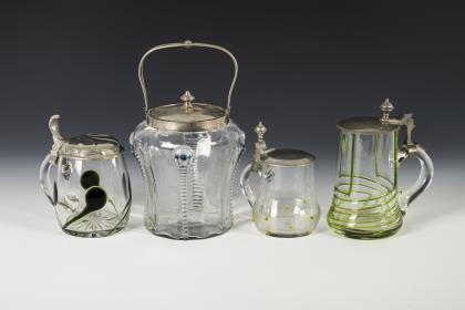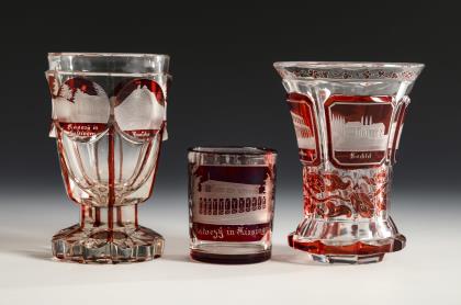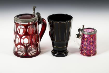 1x kleiner, längsoptischer Bierkrug aus farblosem Glas mit rosafarbenem Innenfang, polychromer, floraler Emailmalerei und zinnmontiertem Scharnierdeckel mit Glaseinsatz (H 10 cm). / 1x konischer Krug aus farblosem, rot gebeiztem Glas mit geschliffenen Linsen, Ohrenhenkel und Zinndeckel mit Glaseinsatz (H 16 cm). / 1x Facettierter Fußbecher aus Rubinglas mit Goldliniendekor (H 13,5 cm)