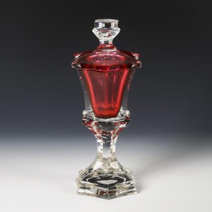 Sechsfach facettierte, leicht kraterförmige Kuppa mit wulstigem, in den massiven Schaft übergehendem Kuppaansatz, Knaufdeckel, polygonaler Fuß; ausgekugelter Abriss. Auf dem Deckelknauf das fein gravierte Wappen des Hauses Wittelsbach