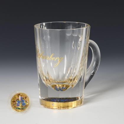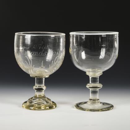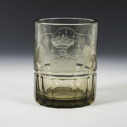 1x Zylinderbecher aus farblosem, bernsteinfarben gebeiztem Glas mit Steinelschliff am Ansatz: umlaufend fein gravierte Symbolarrangements mit der Losung "Gesundheit Glück und Freude bringe dir die Zeit.". / 1x Kelchglas aus farblosem, teils gelb gebeiztem Glas mit Facetten-, Kerb- und Steinelschliff: schauseitig eine Kartusche mit der Darstellung eines Jägers mit Jagdhund