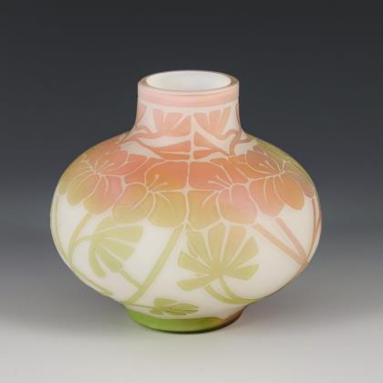 Gedrückt gebauchter Korpus mit kurzem, zylindrischem Hals, Mündung geschliffen. Umlaufend in einem Arbeitsgang geätztes, stilisiertes Blüten- und Blattdekor
