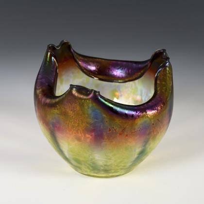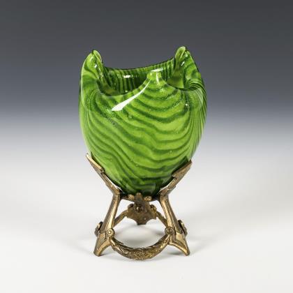 Ovoider Korpus mit dreifach weit nach innen gebogener Mündung. Jugendstil-Metallmontierung mit Festons und drei Füßen