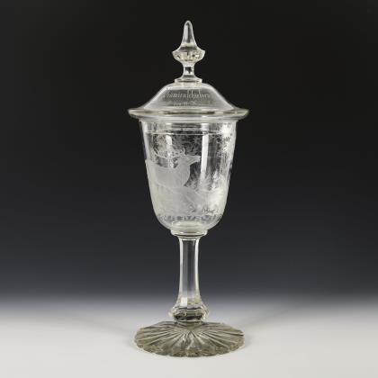 Konische Kuppa, Knaufdeckel, facettierter Schaft, mehrpassiger Fuß. Auf der Kuppa umlaufend die gravierte Darstellung einer Waldlandschaft mit einer einen Hirsch jagenden Hundemeute. Auf dem Deckel die Bezeichnung "Prämienschiessen Crossen a/D. den 22. August 1883."
