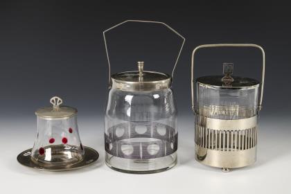 1x Briefbeschwerer, um 1830: Bronze-Ziege auf roter Hyalith-Glasplatte (7 x 12,5 x 7 cm). / 1x facettierter Flakon aus weißem Alabasterglas mit email- und goldgemalten Ranken, Blume, Schmetterlingen und Vögeln (H 17,5 cm). / 1x Kobaltglasflakon mit ornamental-floraler Goldmalerei (H 21 cm). / 1x Fußschale aus grünem Glas mit weißem Überfang und Schliffdekor (H 11,5 cm)