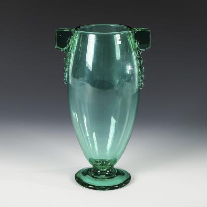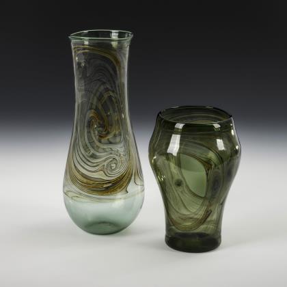 Balustervase aus olivgrünem Glas. / Birnvase aus farblosem und zartgrünem Glas