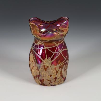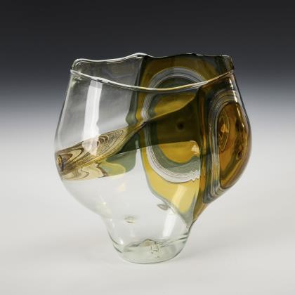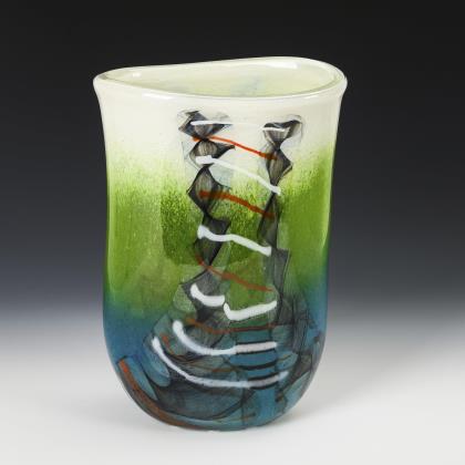 Plattvase aus dickwandigem, farblosem Glas. In der Zwischenschicht opalweiße, hellgrüne und türkisfarbene Pulvereinschmelzungen, opalweiße und rote und schwarze Fäden sowie groß ausgezogene Spiralfäden