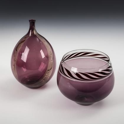 1x aus farblosem und violettem Glas. / 1x aus farblosem und orangerotem Glas