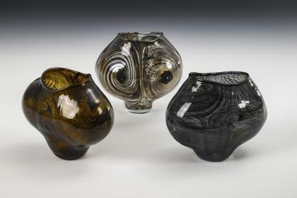 1x Vase aus bernsteinfarbenem Glas mit Emailaufschmelzung in Grau. / 1x Vase aus leicht bläulichem Glas mit grauer und brauner Emailaufschmelzung. / 1x Vase aus farblosem Glas mit braunen und bernsteinfarbenen Emailaufschmelzungen