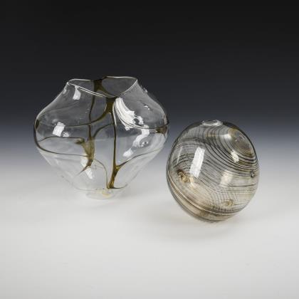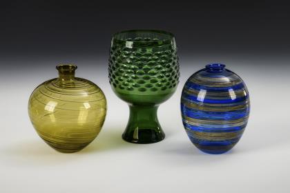 1x aus hellgrünem, dunkelgrünem, farblosem und kobaltblauem Glas. / 1x aus grünem Glas und farblosem Fadenglas mit Opalfaden