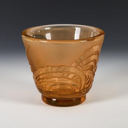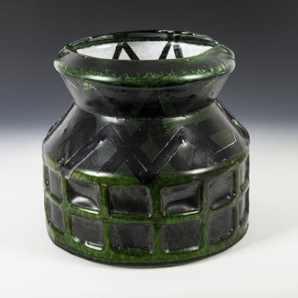 Zylindrischer, zum Stand hin konisch verjüngter Korpus. Umlaufend hochgeätztes, stilisiertes Blattwerk und Punkte, zwischen senkrechten Stegen vierfach rapportierend