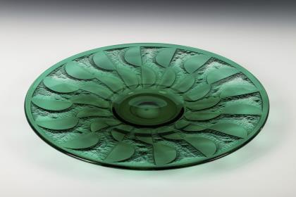 Flacher Teller mit tiefgezogenem Spiegel. Auf der Unterseite ein geätztes, sechzehnfach rapportierendes geometrisches Muster