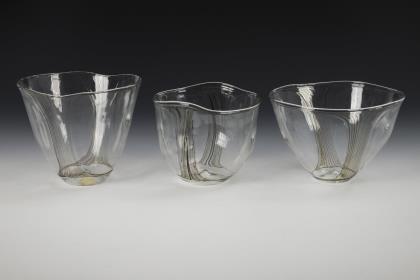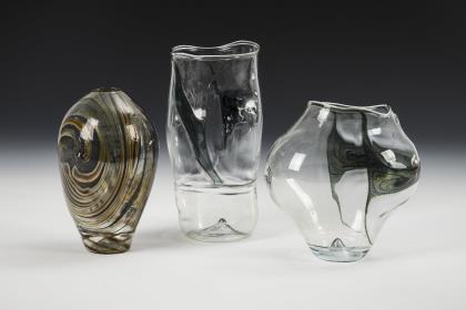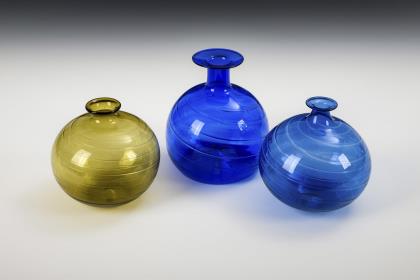 1x aus blauem und farblosem Glas. / 1x aus farblosem Glas. / 1x aus grünem, farblosem und opakorangem Glas