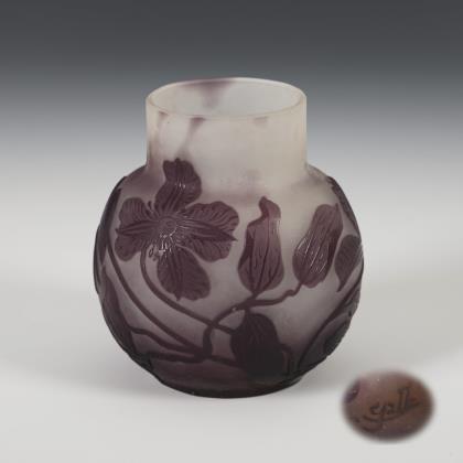 Baluster-Plattvase mit dem geätzten Dekor einer Clematispflanze; ausgekugelter Abriss