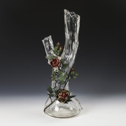 Doppelvase in Form eines Baumstammes mit Astgabel; ausgekugelter Abriss. Am Stamm montiert eine Rosenranke aus polychrom gefasster Bronze