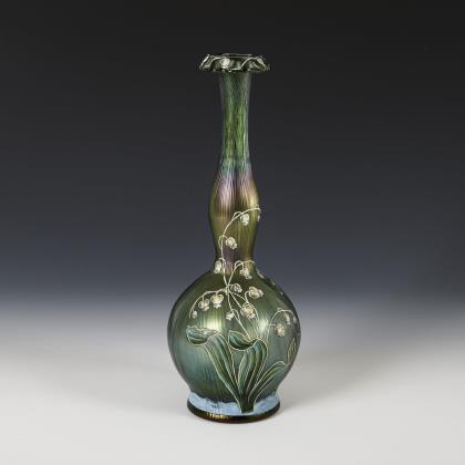 Kugeliger Korpus mit astartiger Struktur, mittig geweitetem Enghals und nach außen gebogenem, mehrfach gekniffenem Mündungsrand; ausgekugelter Abriss. Schauseitig eine emailgemalte Maiglöckenpflanze