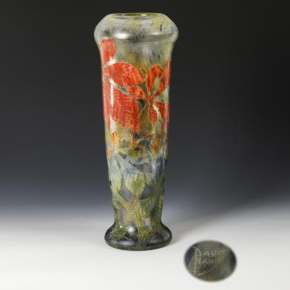 Hohe Vase mit umlaufend geätzten Kastanienzweigen; ausgekugelter Abriss