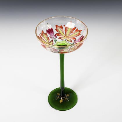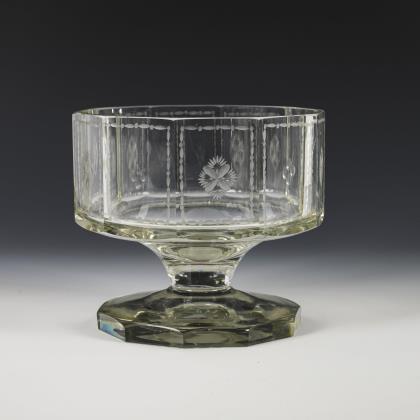 Längsoptische Schale in Form eines Blütenkelches mit acht grünen Nuppen, spiraloptischer Hohlnodus mit sechs Beerennuppen, metallmontiert (versilbert, bezeichnet "Silverplated") auf sechsfach gewelltem Fuß mit Tropfenauflagen