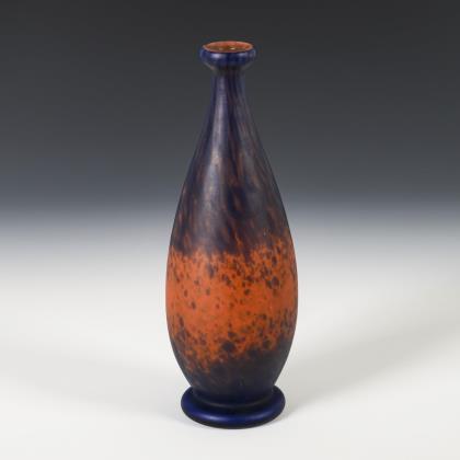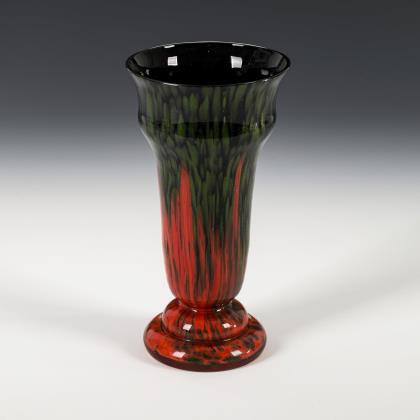 Gefußte Balustervase aus farblosem Glas mit fleckigen Pulveraufschmelzungen in Orange- und Brauntönen