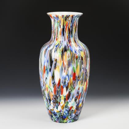 Balustervase aus weißem Milchglas mit dicht aufgeschmolzenen Millefiori-Canes und Klarglasüberfang
