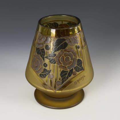 Doppelkonischer Korpus mit angesetztem Rundfuß; ausgekugelter Abriss. Oberfläche partiell mattgeätzt mit blanken Stegen. Schauseitig eine Kartusche mit Rosen, schwarz und silbergrau bemalt und mit brauner Binnenzeichnung, verso eine Rosenblüte in gleicher Technik