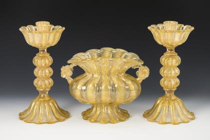 3teilige Tafelgarnitur: Leuchterpaar und Jardiniere. Barovier & Toso.
