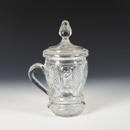 Nach oben geweiteter, mittig facettierter Korpus mit Bandhenkel und Knaufdeckel. Mit reichem Kerb- und Steinelschliff