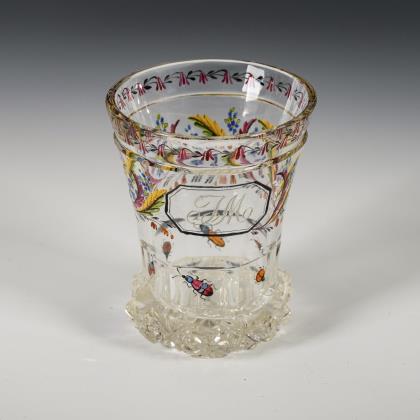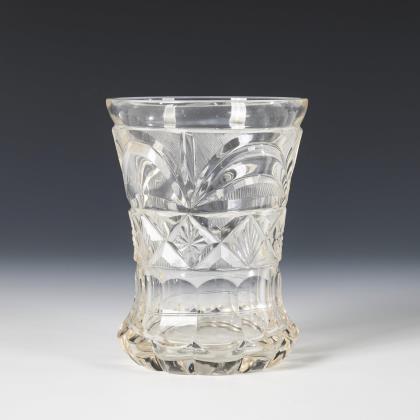 Ranftbecher mit reichem Facetten-, Kerb- und Steinelschliffdekor. Auf der Wandung das gravierte Monogramm "J.W.", auf dem Boden die Bezeichnung "Landeck im August 1833"