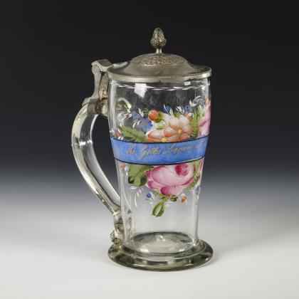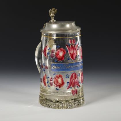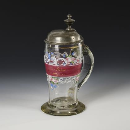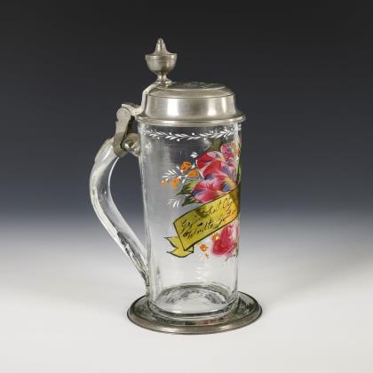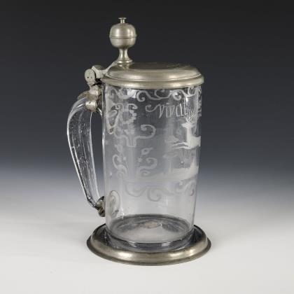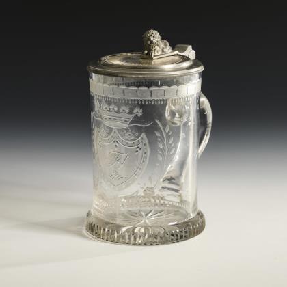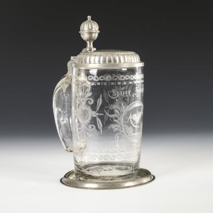 Walzenkrug mit Bandhenkel und jünger ergänztem, zinnmontiertem Scharnierdeckel mit Löwendrücker; Bodenstern. Schauseitig ein graviertes, teils poliertes Wappenschild mit dem Monogramm "FS" und einer Adelskrone