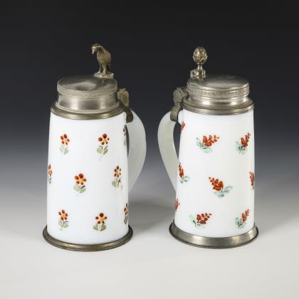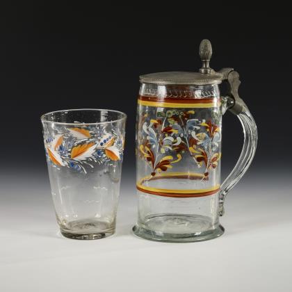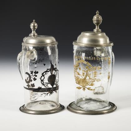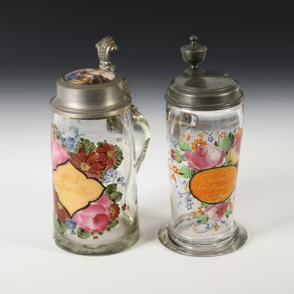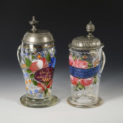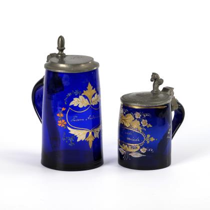 2 Kobaltglas-Bierkrüge mit Emailmalerei