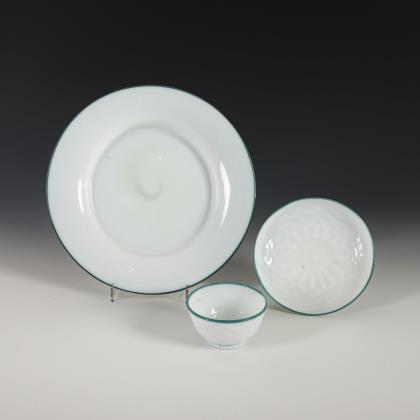 1x Kelchglas mit facettierter, am Ansatz wabenfacettierter Kuppa, facettiertem Schaft und Rundfuß: auf der Kuppa vegetabile Goldmalerei (H 17 cm). / 1x facettierter Henkelbecher mit goldgemalten Girlanden (H 8,5 cm). / 1x Likörglas mit geometrischer gravierter Bordüre, wabenfacettiertem Schaft und Rundfuß (H 10,5 cm)