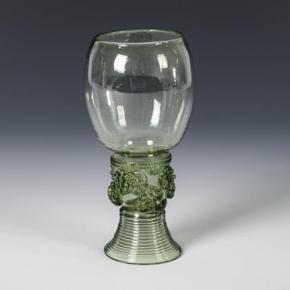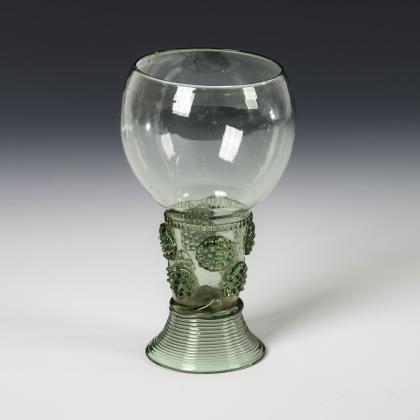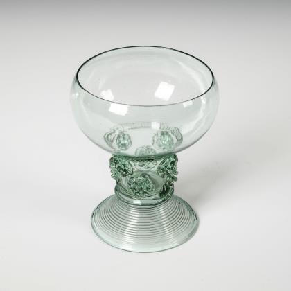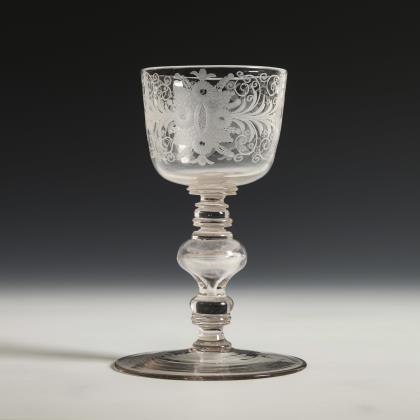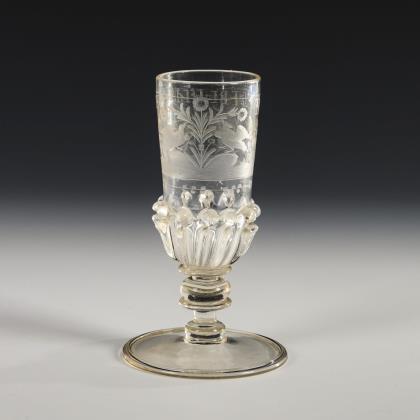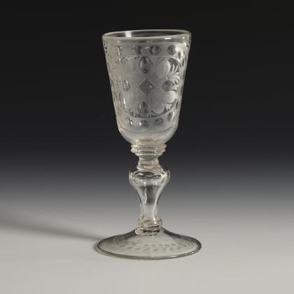 Konische, am Ansatz wabenfacettierte Kuppa, wabenfacettierter Balusterschaft mit eingestochener Luftblase, Rundfuß mit nach unten umgeschlagenem Rand; Abriss. Schauseitig auf der Kuppa ein graviertes Wappen mit Hifthorn, wahrscheinlich das Herzogtum Jägerndorf (zu Liechtenstein) repräsentierend