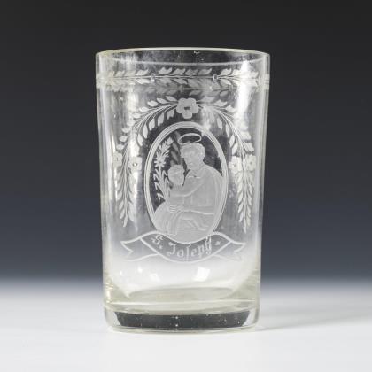 Leicht konischer Becher mit gravierten Floralbändern, schauseitig ein Medaillon mit der bezeichneten Darstellung des heiligen Joseph mit Jesusknaben