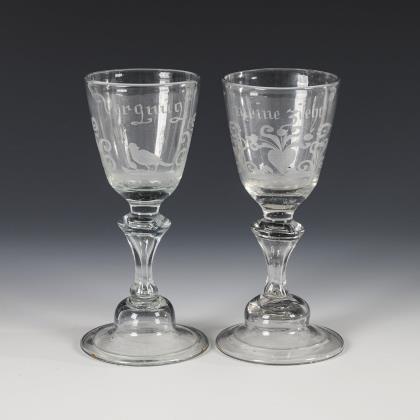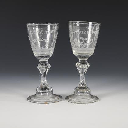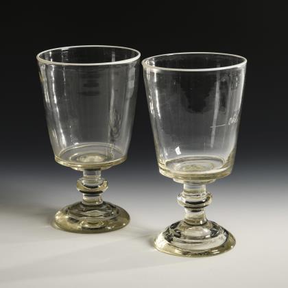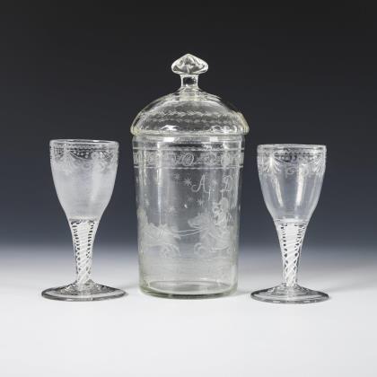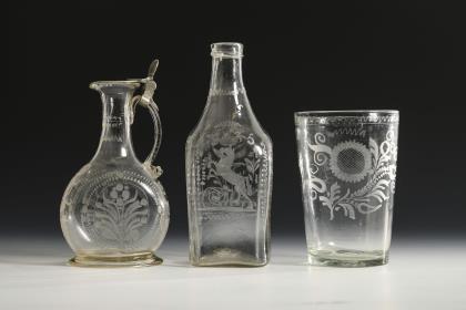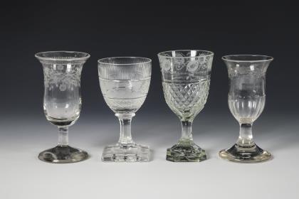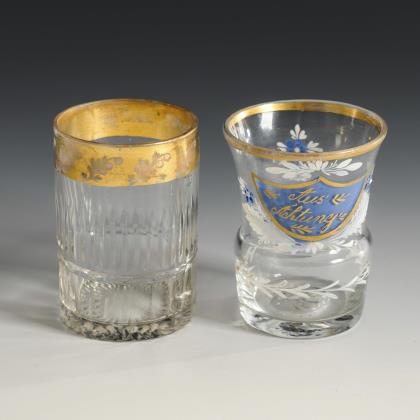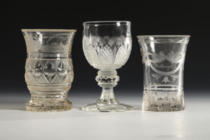 2x um 1840: 1x Fußbecher mit Schliffdekor: in zwei Kartuschen die gravierten und bezeichneten Ansichten des Neuen und Alten Brunnens zu Flinsberg. / 1x Kraterbecher mit Kerb- und Steinelschliff: schauseitig ein graviertes, floral gerahmtes Schild mit dem Namen "Walburga. G.". / 1x 20. Jh.: Weinglas mit Schliffdekor