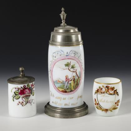 1x Kelchglas mit konischer Kuppa und Rundfuß (H 14,5 cm). / 1x Ranftbecher mit Juwelenmalerei und der Aufschrift "Auch auf dem Gröditzberge dacht ich Dein.". / 1x Glockenbecher mit silberner vegetabiler Malerei (H 9,5 cm)