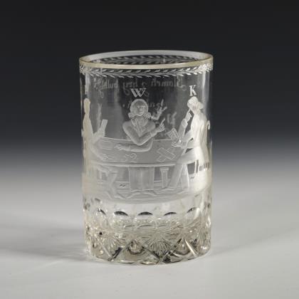 Zylinderbecher mit Linsenschliffband und Bodenstern. Schauseitig die gravierte Darstellung dreier mit Buchstaben bezeichneter Kartenspieler an einem Tisch, verso tschechich bezeichnet mit den Namen der Spieler "Blomek z hry bulky zaratej P. Aliter / K. Nedam. / W. Prohras."
