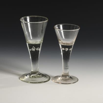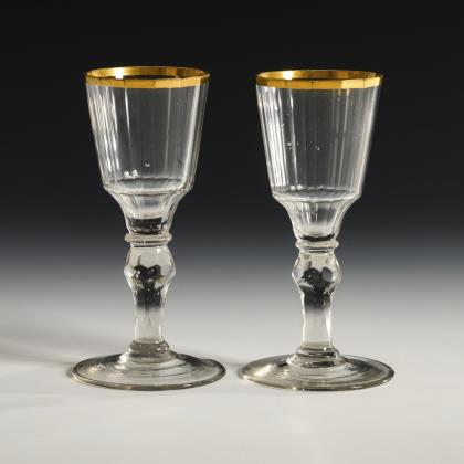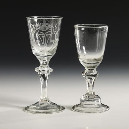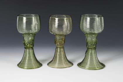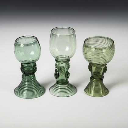 3x wohl Frankreich, 18. Jh.: glockenförmige, wabenoptisch formgeblasene Kuppa, gerippter Nodus, Balusterschaft mit eingestochener Luftblase, Rundfuß mit nach unten umgeschlagenem Rand; Abriss (H ca. 15,5 cm). / 1x Thüringen, 2. H. 18. Jh.; konische, in den Schaft mit eingestochener Luftblase übergehende Kuppa, Rundfuß mit nach unten umgeschlagenem Rand; Abriss (H 16 cm)