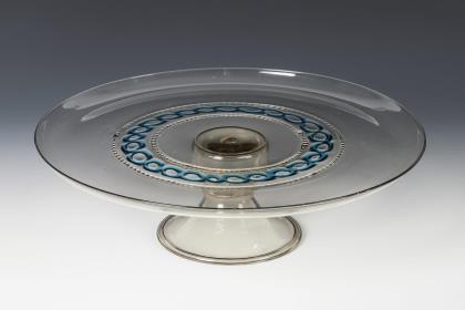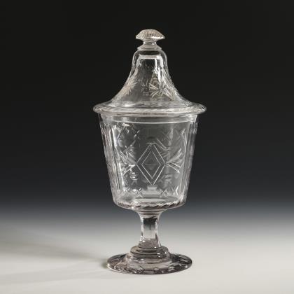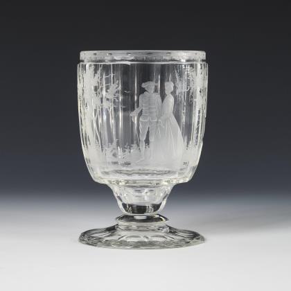 Mehrfach facettierte Glockenkuppa, kurzer Schaft, Rundfuß mit Kerb- und Linsenschliff. Schauseitig auf der Kuppa die fein geschnittene Darstellung einer Landschaftsinsel mit galantem Paar