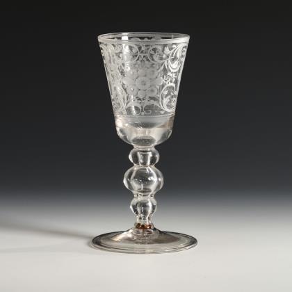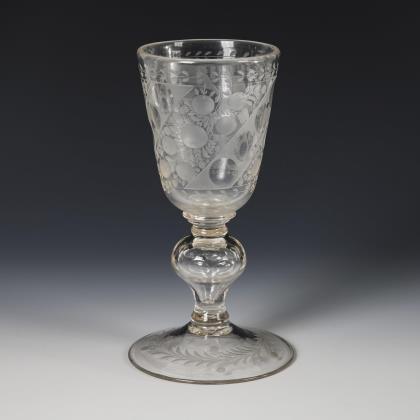 Glockenkuppa, Hohlbalusterschaft mit Linsen, Rundfuß; Abriss. Auf der Kuppa drei Linsenschliffbänder, gravierte Fruchtbukettbänder und Blütenbänder mit Linsen, auf dem Fuß ein Floralkranz